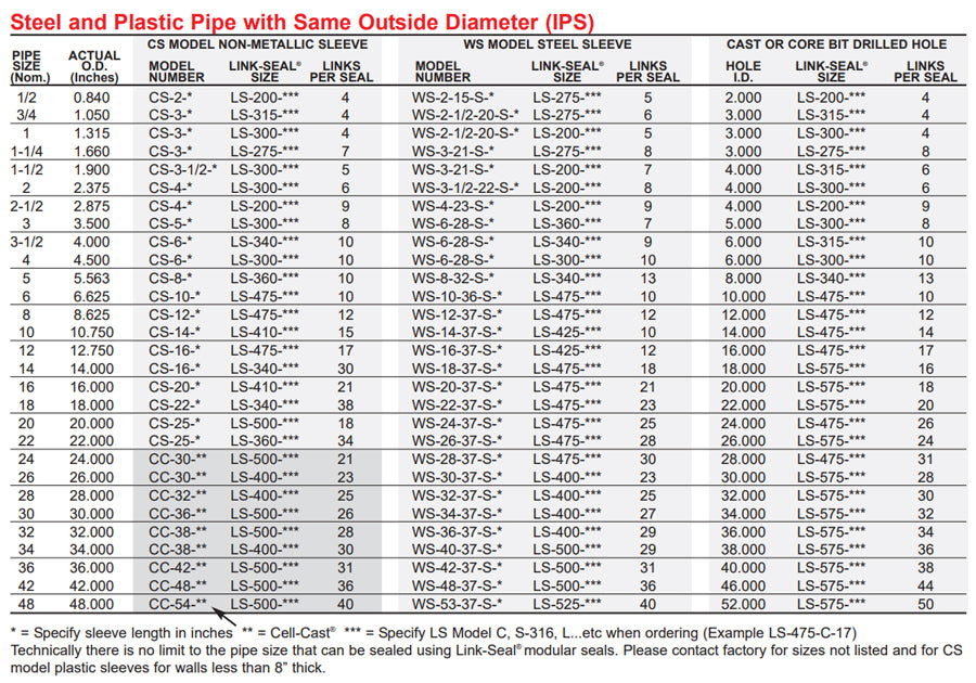 Sizing Chart – Note, reference the link seal sizing chart to determine the type and number of links you’ll need for your pipe application.