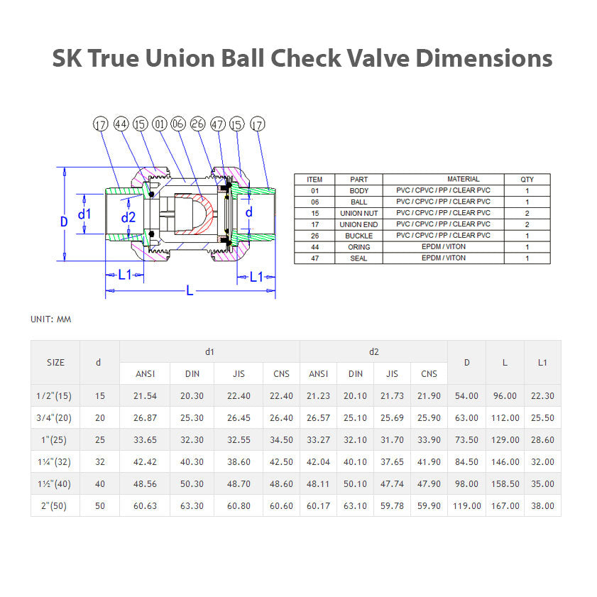 1 inch Sch 80 CPVC True Union Ball Check Valve (S x S) SK-CTUBC-S-010
